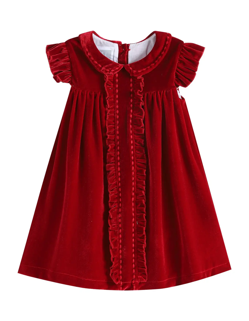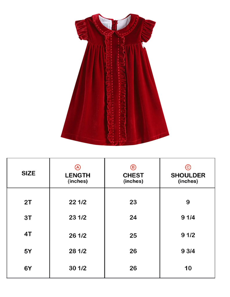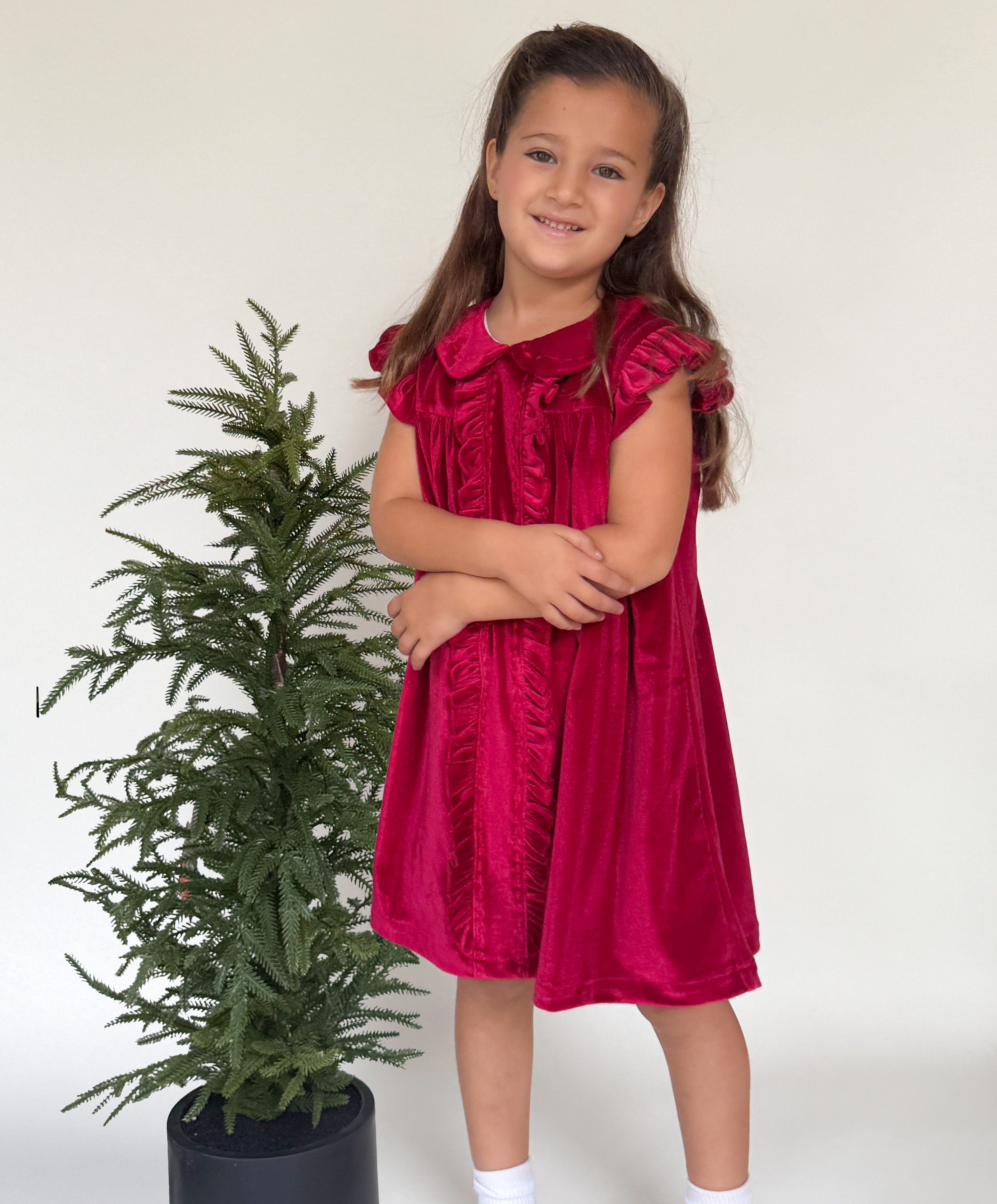 Elegante y festivo, este vestido de terciopelo rojo está diseñado para hacer que cada momento sea memorable. Forrado con suave tela 100% algodón, incluye un delicado cuello ¨Peter Pan¨ y detalles de costura exquisitos que lo convierten en la elección perfecta para brillar en estas fiestas.