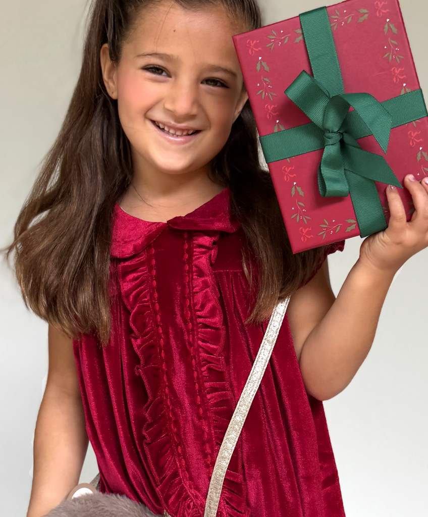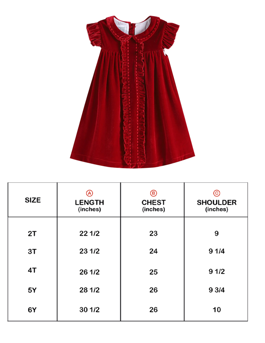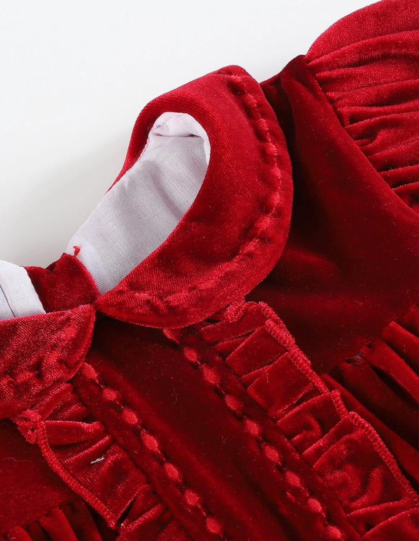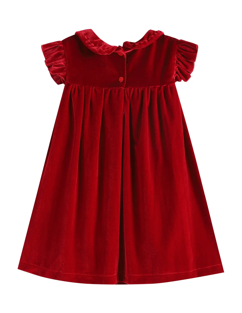 Elegante y festivo, este vestido de terciopelo rojo está diseñado para hacer que cada momento sea memorable. Forrado con suave tela 100% algodón, incluye un delicado cuello ¨Peter Pan¨ y detalles de costura exquisitos que lo convierten en la elección perfecta para brillar en estas fiestas.