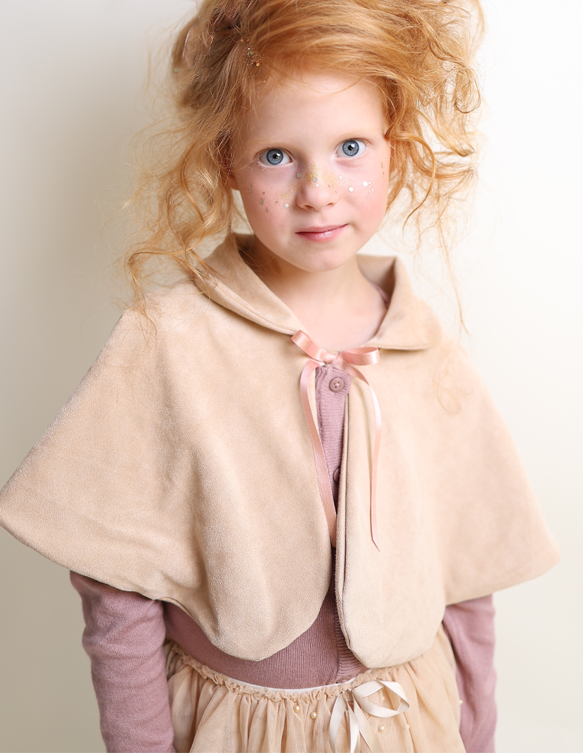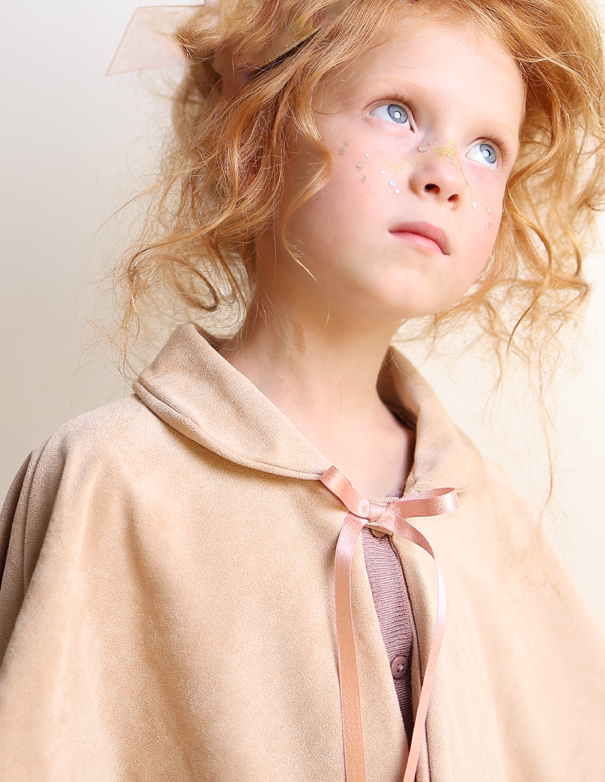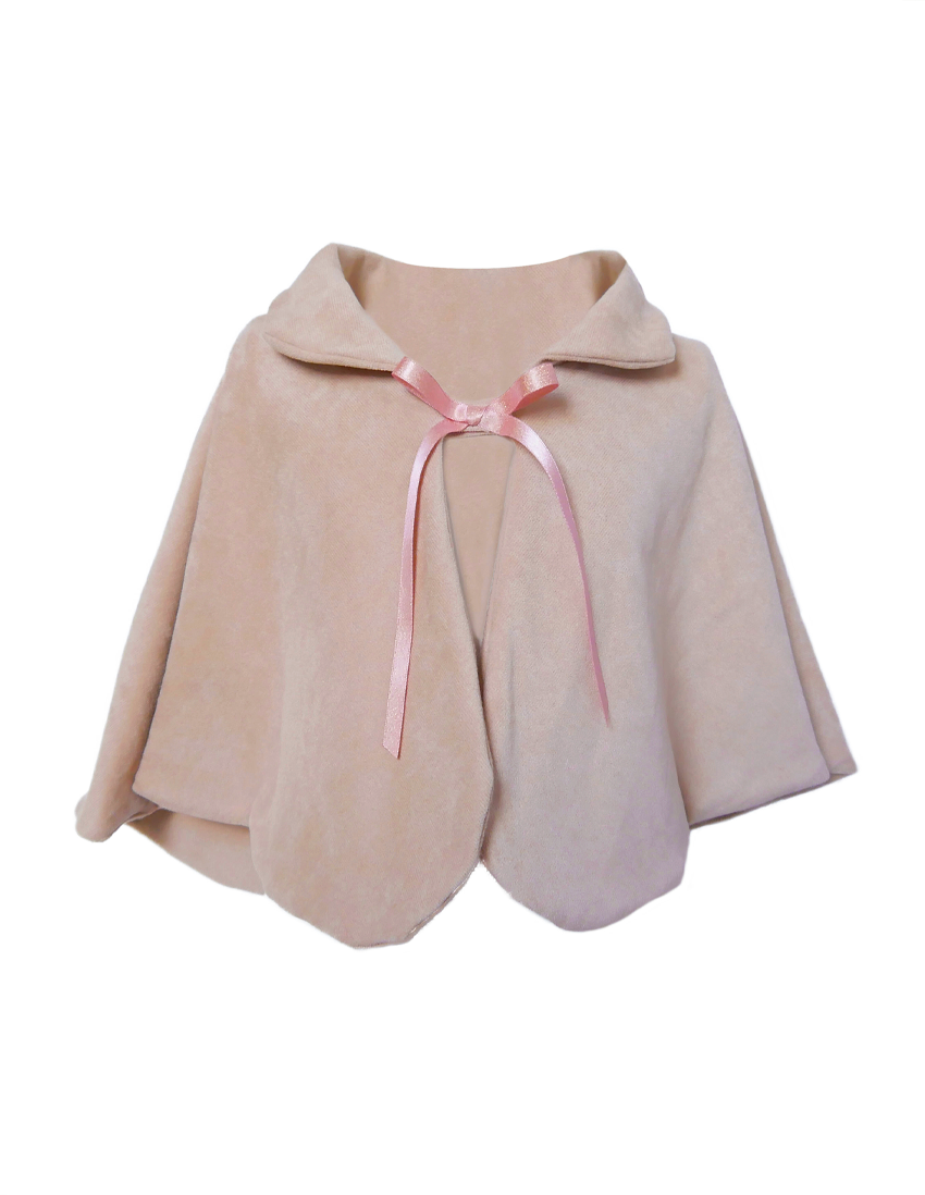 Esta adorable capa es el complemento perfecto y el accesorio más original! Hecha de un suave terciopelo en un hermoso tono beige. Se abrocha fácilmente con un práctico cierre de velcro con un moñito de satén.