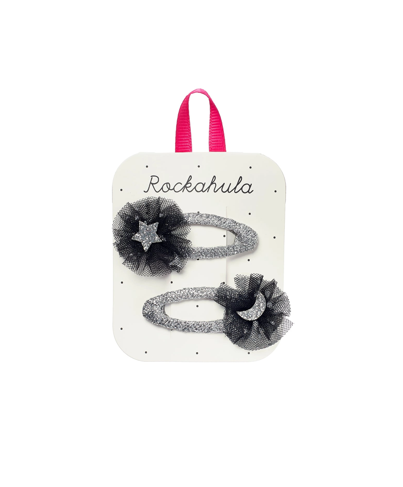 Este par de cucas elevará y complementará cualquier outfit, dándole un toque mágico Cy único! Tiene dos hermosos volantes de tul, decorados con una luna y una estrella brillante, y están montados en clips de presión envueltos en cinta plateada, cómodos y hermosos listos para elevar el look de tu pequeñita 🌙⭐