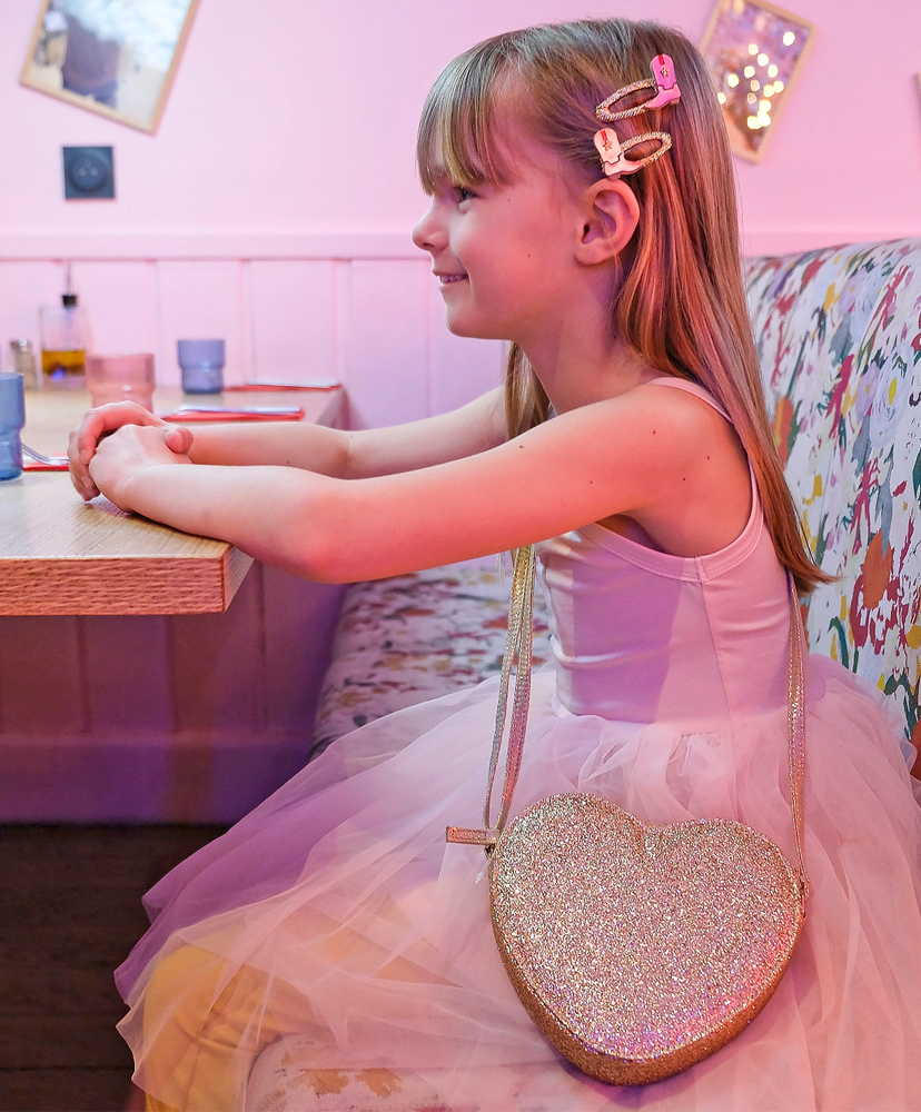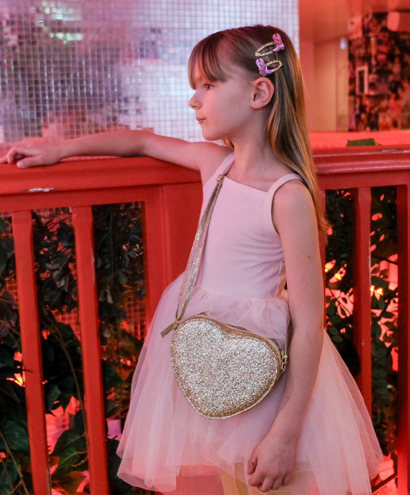 Confeccionado en un hermoso glitter dorado, esta bolsita es encantadora y sus niñas la amarán! ✨ Cuenta con cierre de zipper, forro con puntitos dorados y una correa dorada ajustable con punto de seguridad. ¡El accesorio perfecto para cualquier fiesta! 🎉