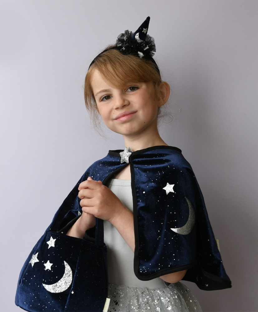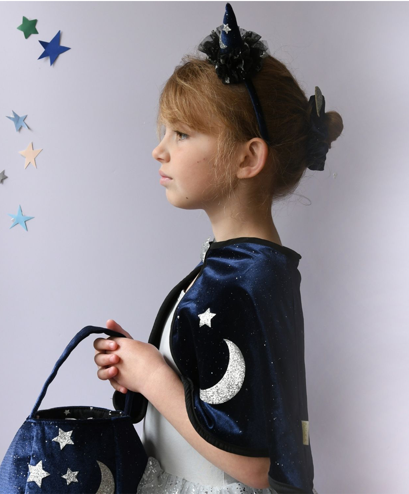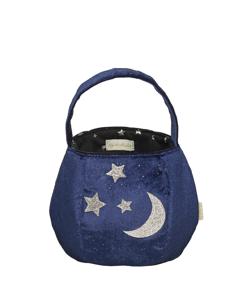 Hecha con el terciopelo más suave y brillante, decorada con motivos de lunas y estrellas llenas de glitter. 🌙⭐ Forrada por completo con tela negra estrellada y con un asa de terciopelo, es el accesorio ideal para trick or treat 🎃🍬. Su forma de cubetita ofrece el espacio perfecto para guardar todos los dulces que encuentres.