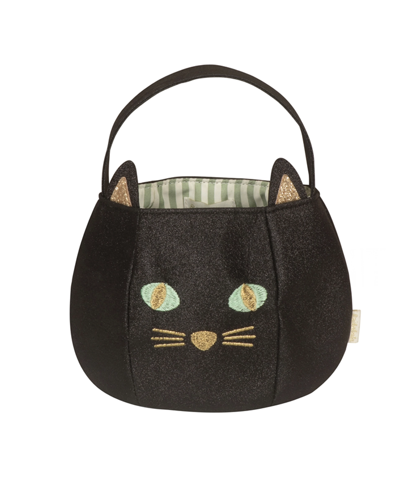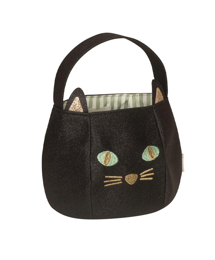 Esta bucket bag de gatito está hecha con el glitter más suave y brillante en color negro, con ojitos bordados en verde esmeralda, bigotitos dorados y orejitas llenas de brillo. 🌟 Forrada con tela de rayas verdes y con un asa muy práctica para cargarla, es el accesorio ideal para pedir dulces este Halloween. 🎃👻. Su forma de cubetita ofrece el espacio perfecto para guardar toooodos los dulces favoritos. 🍬🍭