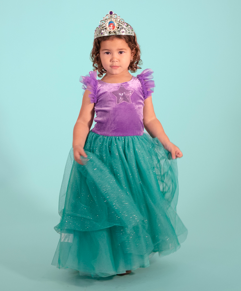 Transforma a tu pequeñita en hermosa sirena! Este vestido es perfecto para jugar por horas, es super cómodo, no tiene zipper ni botones, se pone y se quita fácilmente, esta hecho con una tela super suave de terciopelo y las faldas tienen varias capas de tul en tonos de azul turquesa, estamos seguras que les encantará!