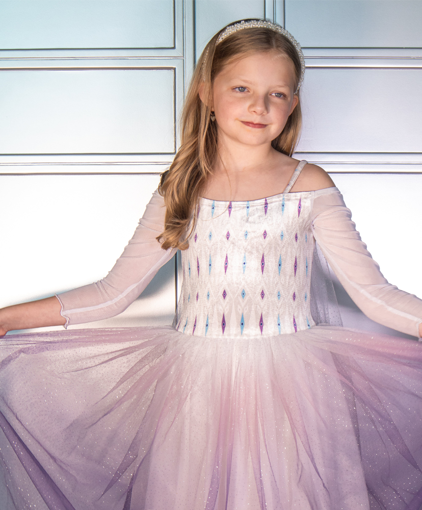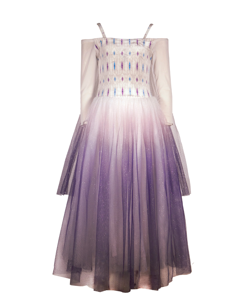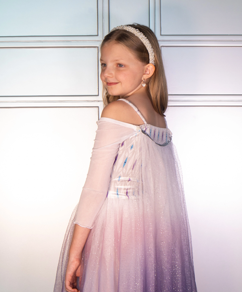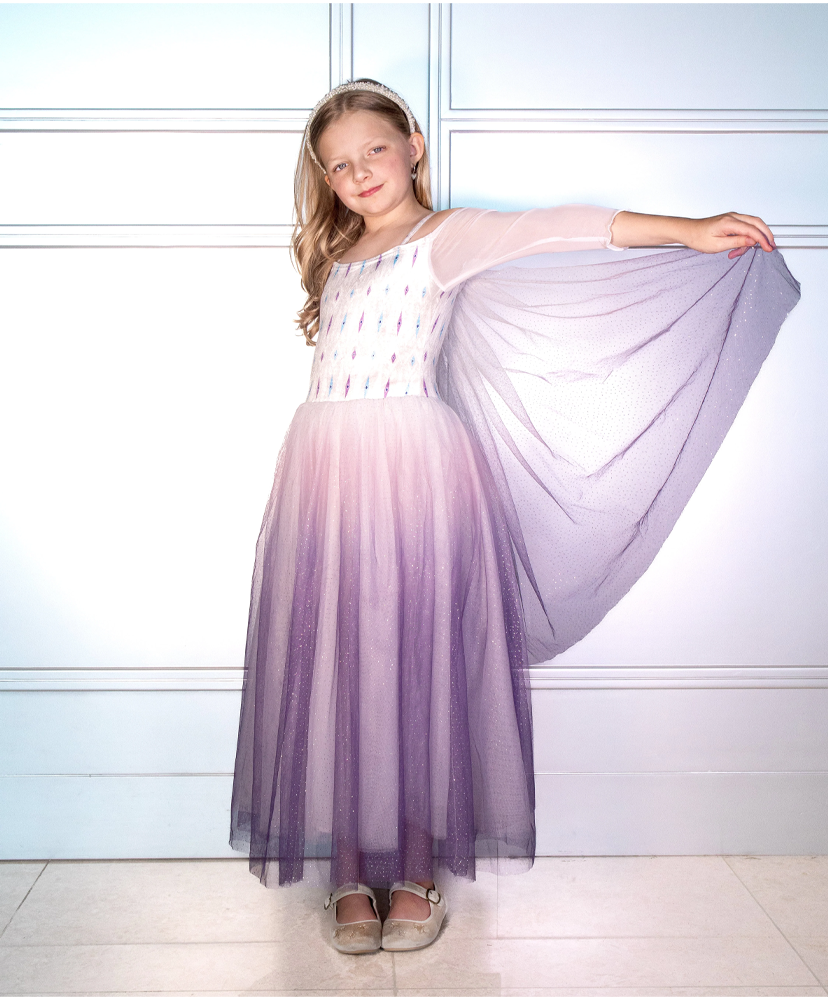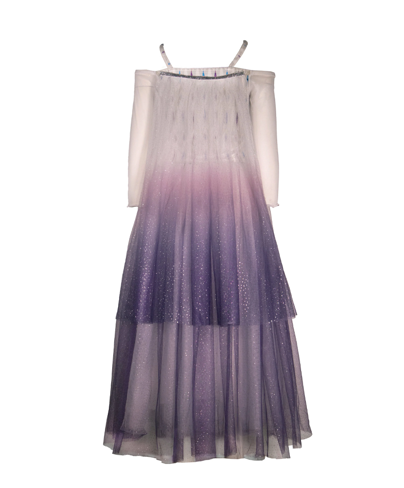 El top tiene un diseño impreso inspirado en el vestido de Elsa en la película frozen 2, la falda luce un lindo degradado de morado a blanco con destellos brillantes, y la capa de tul ligera (removible) le da ese toque real en cada movimiento.