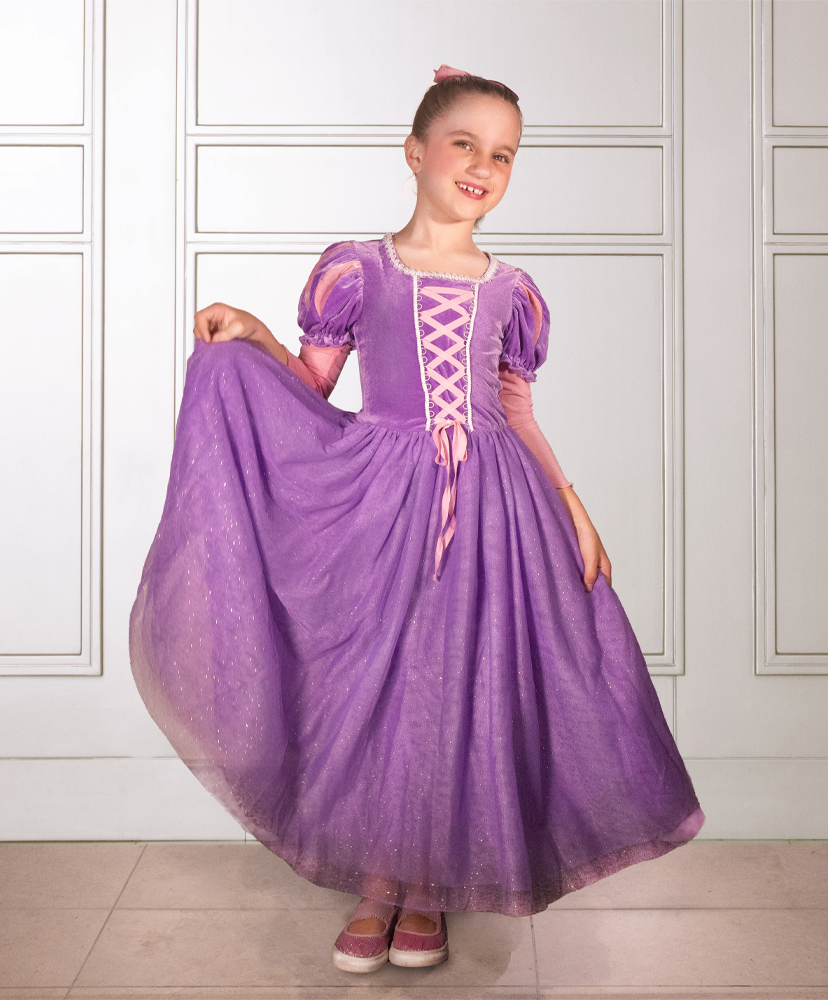 Una de las princesas mas valientes, creativas, alegres y divertidas llega a She's Electric con este espectacular vestido hecho con tela suave de terciopelo stretch, adornado con un listón plateado en el centro, las mangas tienen un look medieval y la falda esta hecha de muchas capas de tul brillante.