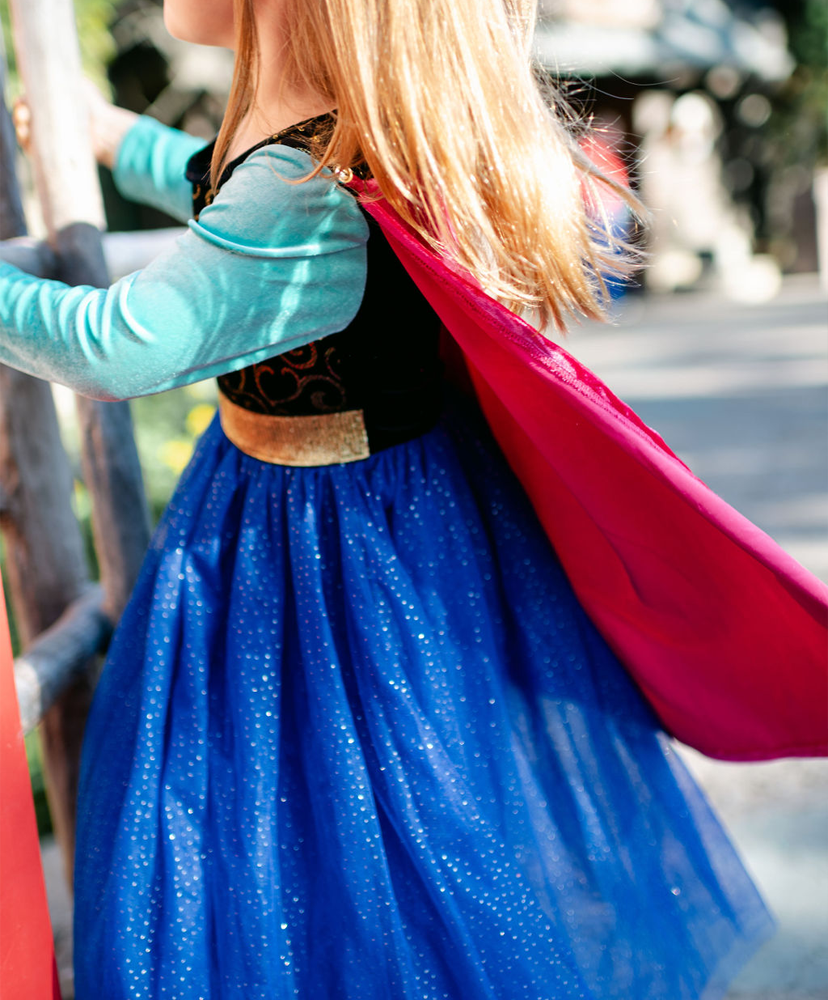 La versión clásica de Anna de Frozen llega con este diseño hermoso! La falda esta hecha de varias capas de tul brillante, el torso tiene un diseño en dorado espectacular, la tela es stretch, delgadita y muy cómoda, ideal para jugar por horas !