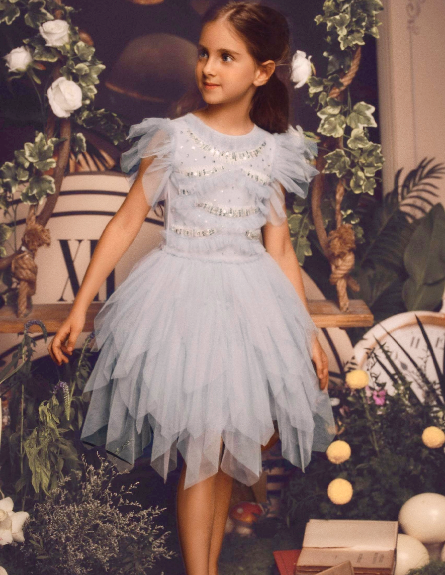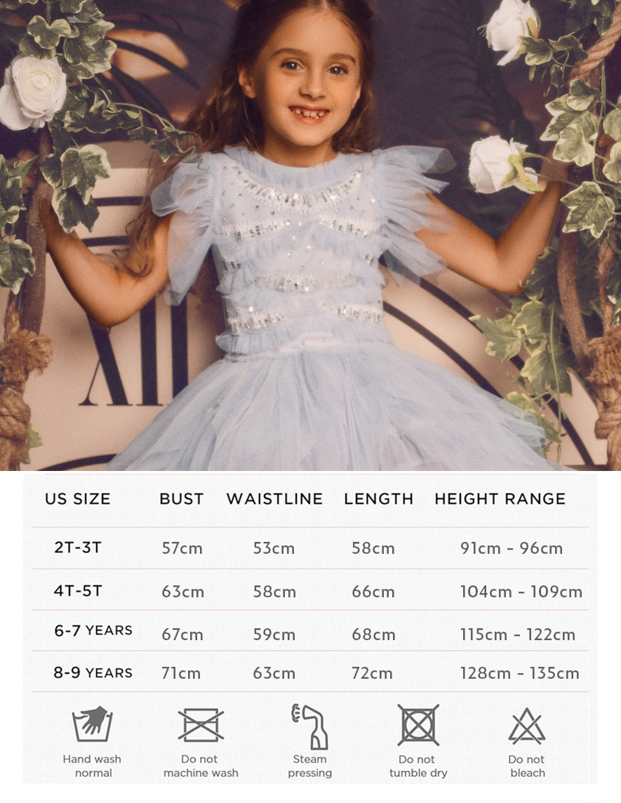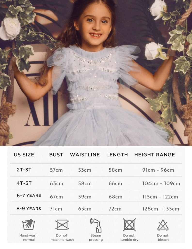 Perfecto para las pequeñas que aman girar, jugar y brillar. Con sus delicadas mangas vaporosas, flores de satén con lentejuelas cosidas a mano y una falda de tul en capas que da el volumen ideal para cada giro, este vestido es pura fantasía. Su cintura elástica lo hace cómodo y práctico para cualquier ocasión especial.