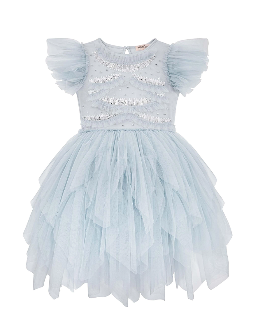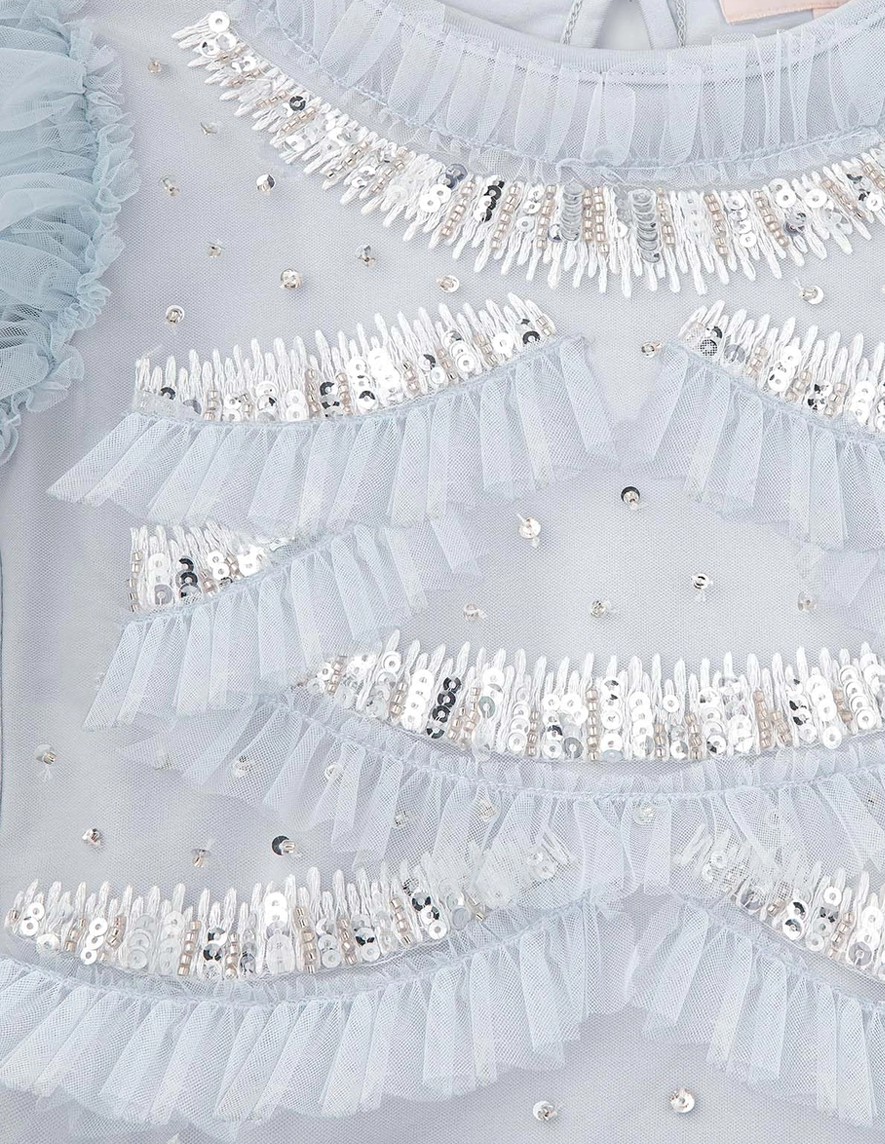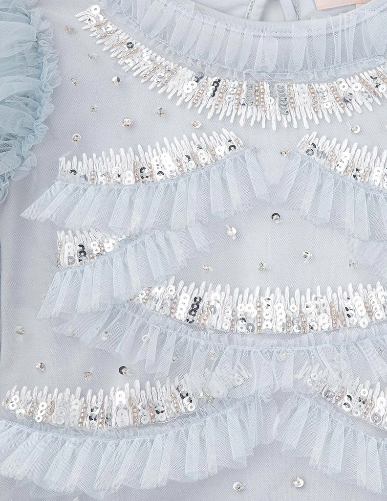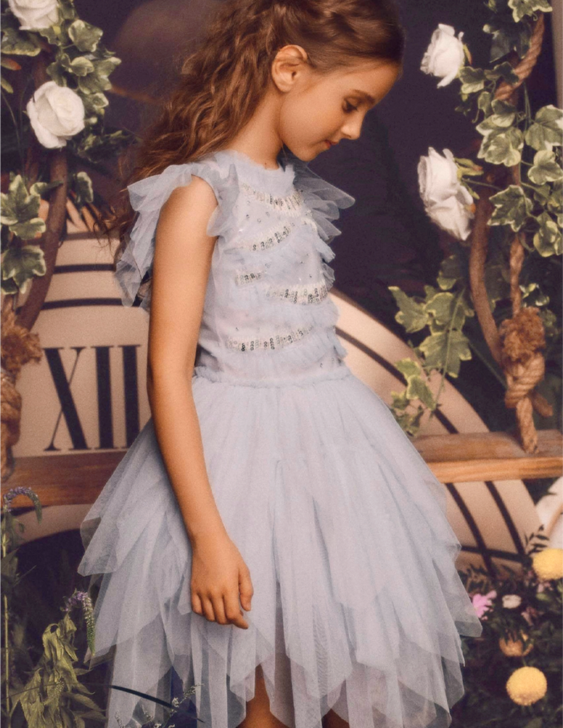 Perfecto para las pequeñas que aman girar, jugar y brillar. Con sus delicadas mangas vaporosas, flores de satén con lentejuelas cosidas a mano y una falda de tul en capas que da el volumen ideal para cada giro, este vestido es pura fantasía. Su cintura elástica lo hace cómodo y práctico para cualquier ocasión especial.