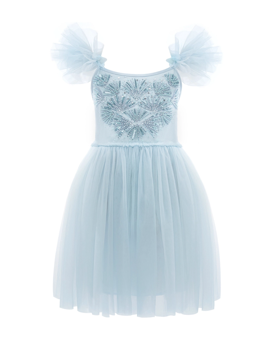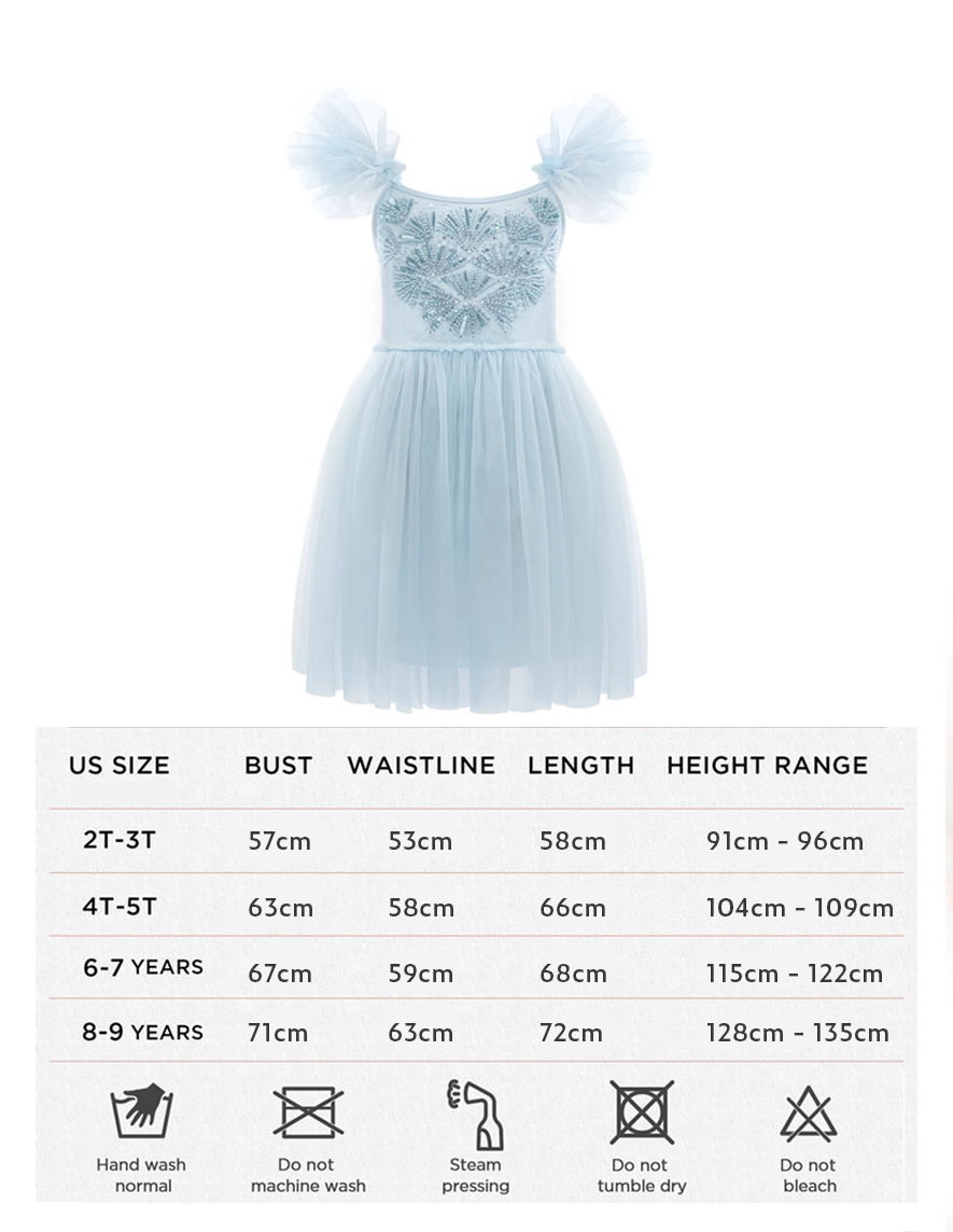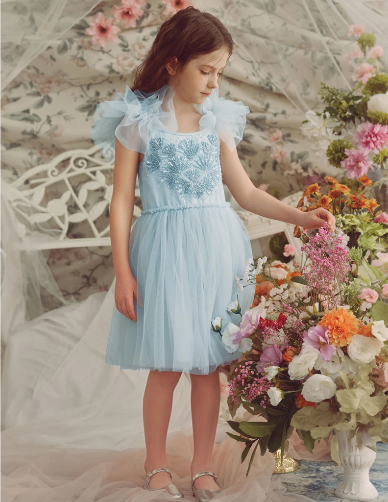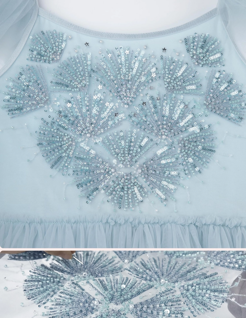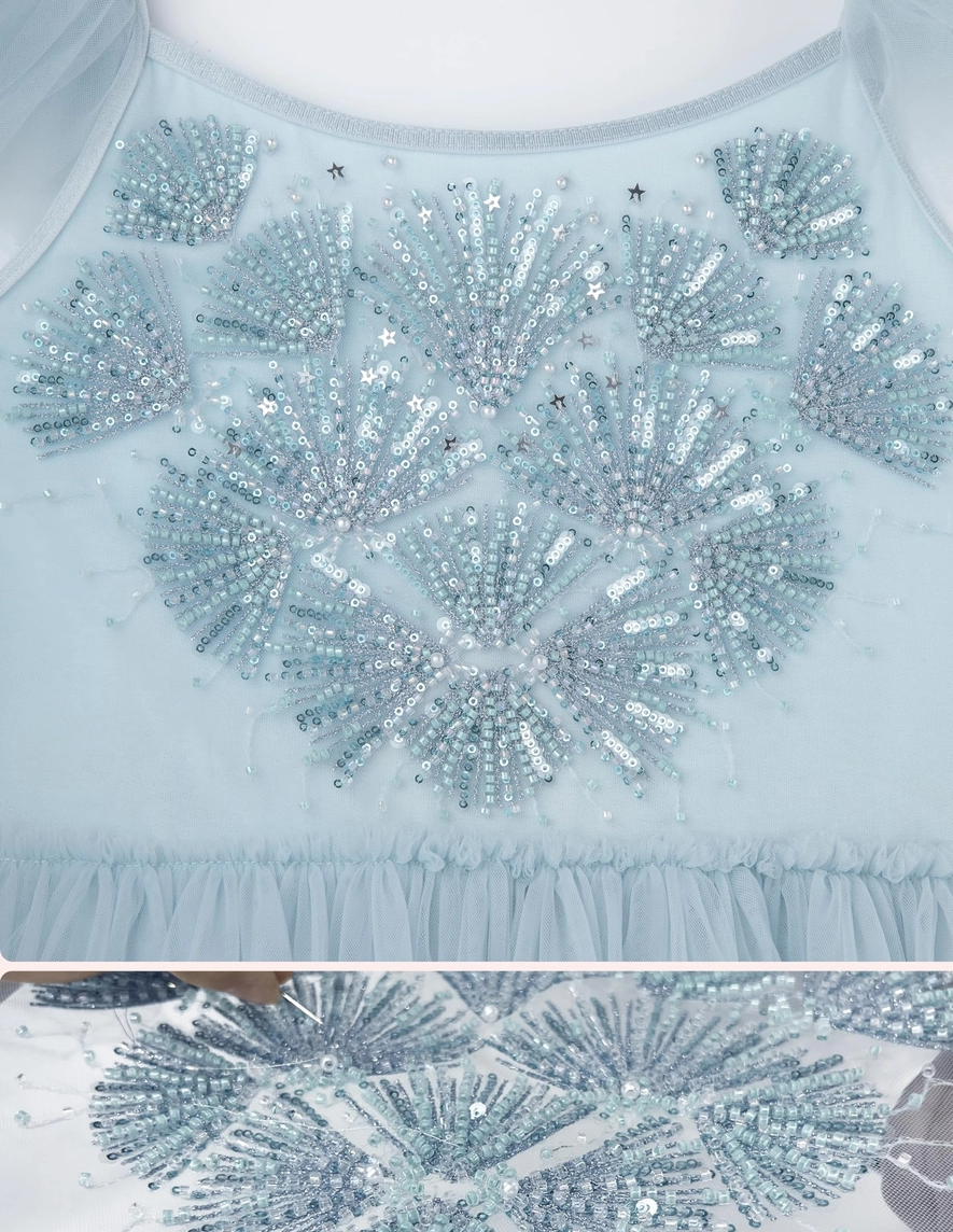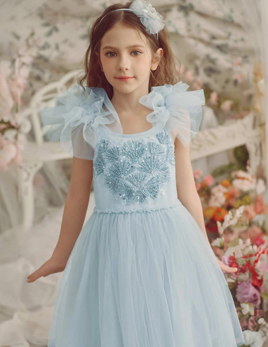 Hermoso vestido en azul claro con delicados volantes de tul en los hombros. Sus tirantes ajustables garantizan el ajuste perfecto, mientras que las lentejuelas cosidas a mano añaden un toque de brillo encantador. Confeccionado en suave algodón stretch y una falda de múltiples capas de tul, es ideal para girar, jugar y sentirse como una verdadera princesa. Perfecto para cualquier evento formal en familia. ✨