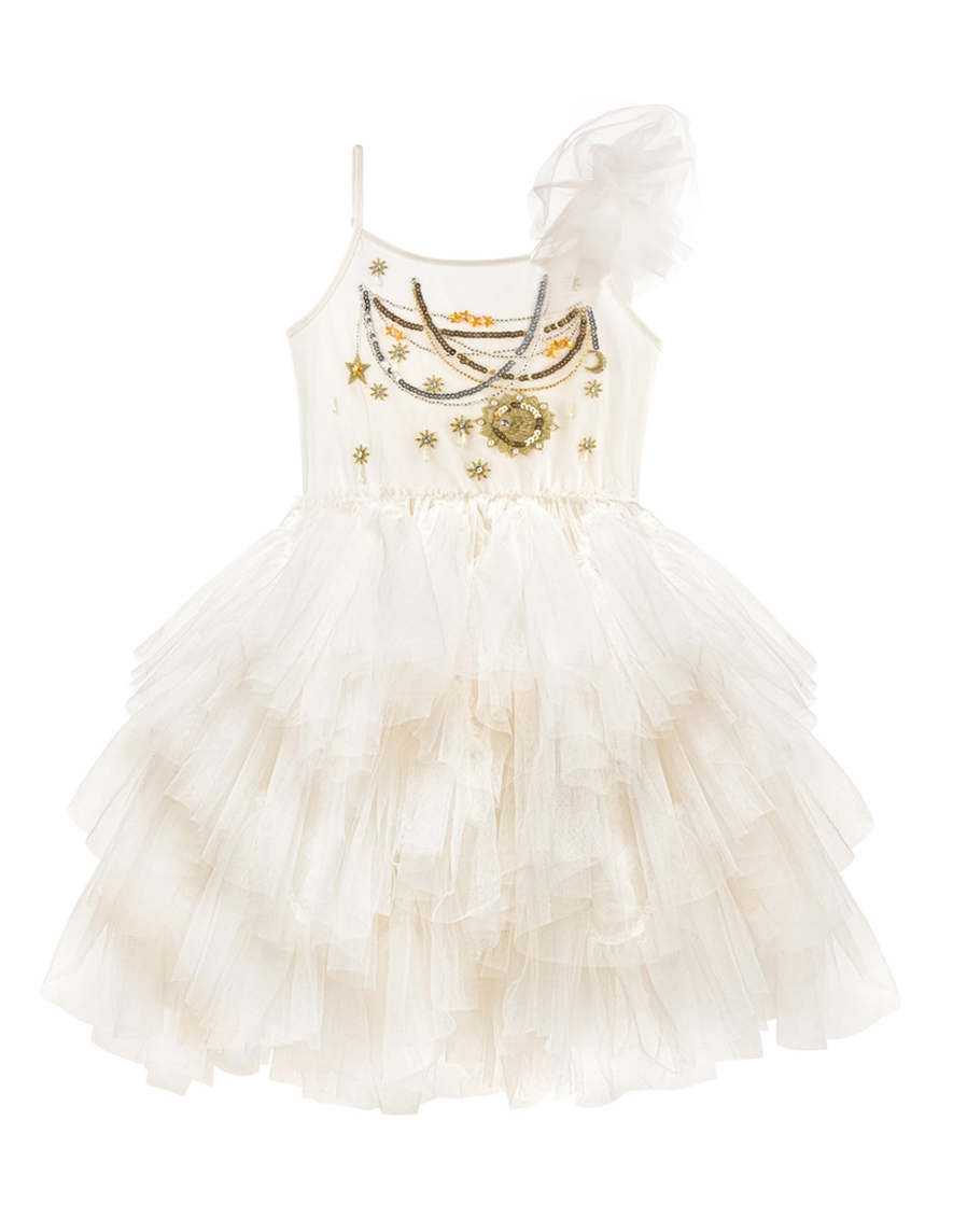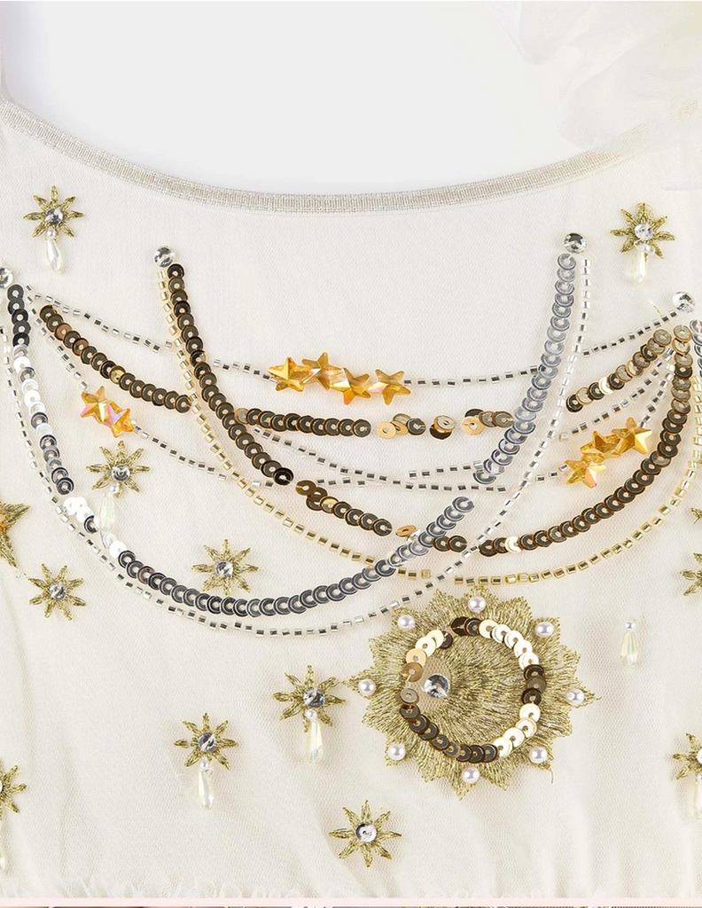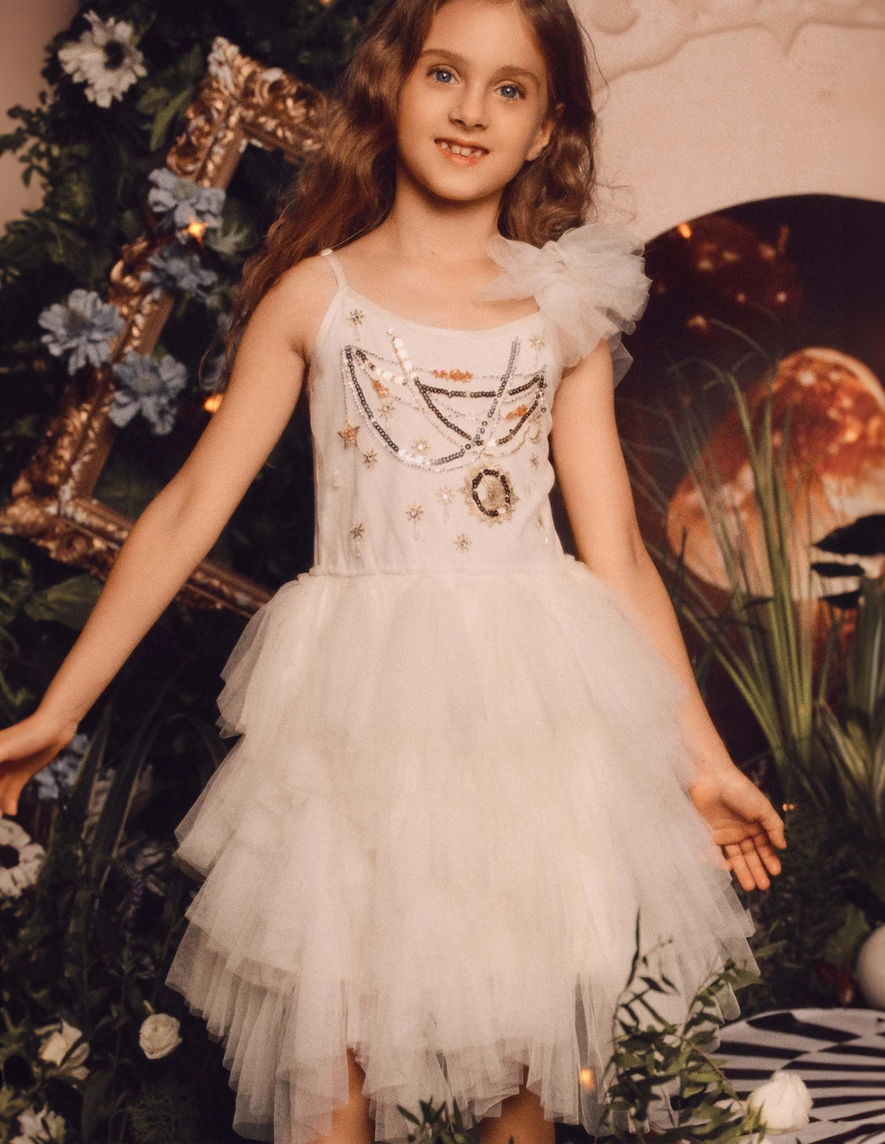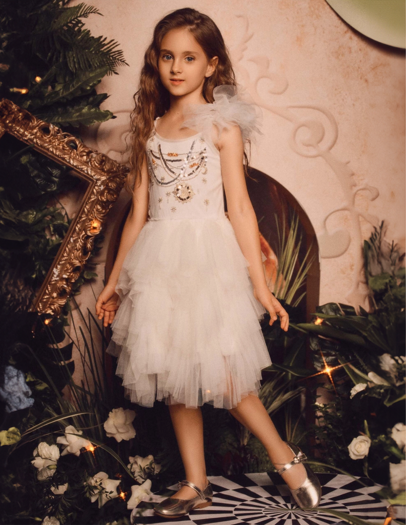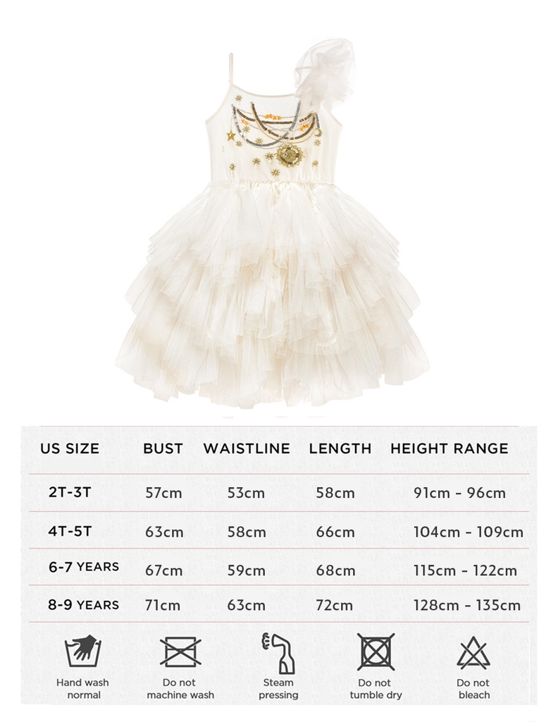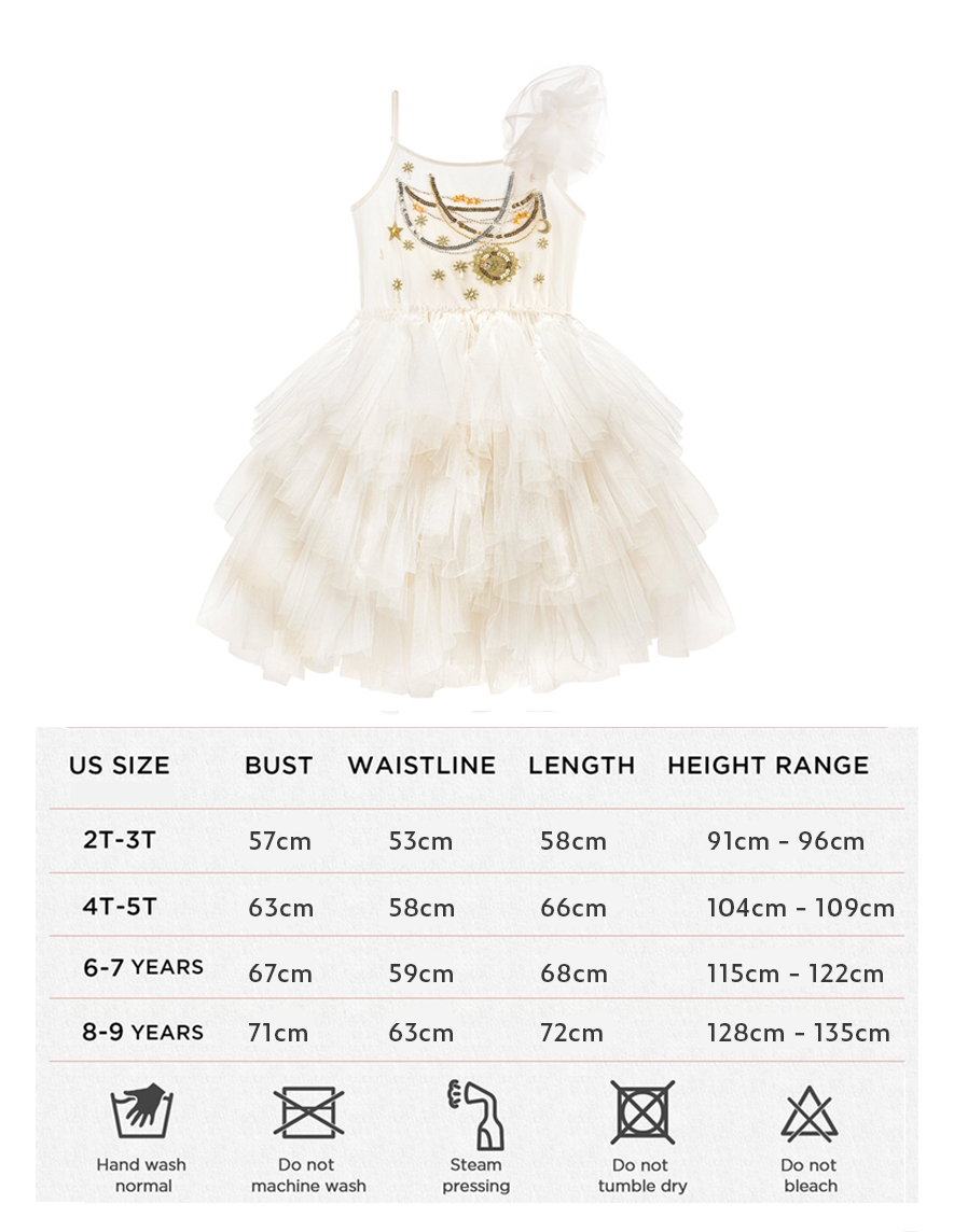 Este vestido de tirantes ajustables es todo un encanto. Con un delicado tul en una de las mangas y una falda de varias capas de tul en diferentes tamaños, tiene un toque único y sofisticado. Las lentejuelas doradas bordadas al frente le dan un brillo especial, creando un look elegante y encantador. Es el vestido ideal para lucir espectacular en ese evento especial, ¡todos se enamorarán de lo original y femenino que es!