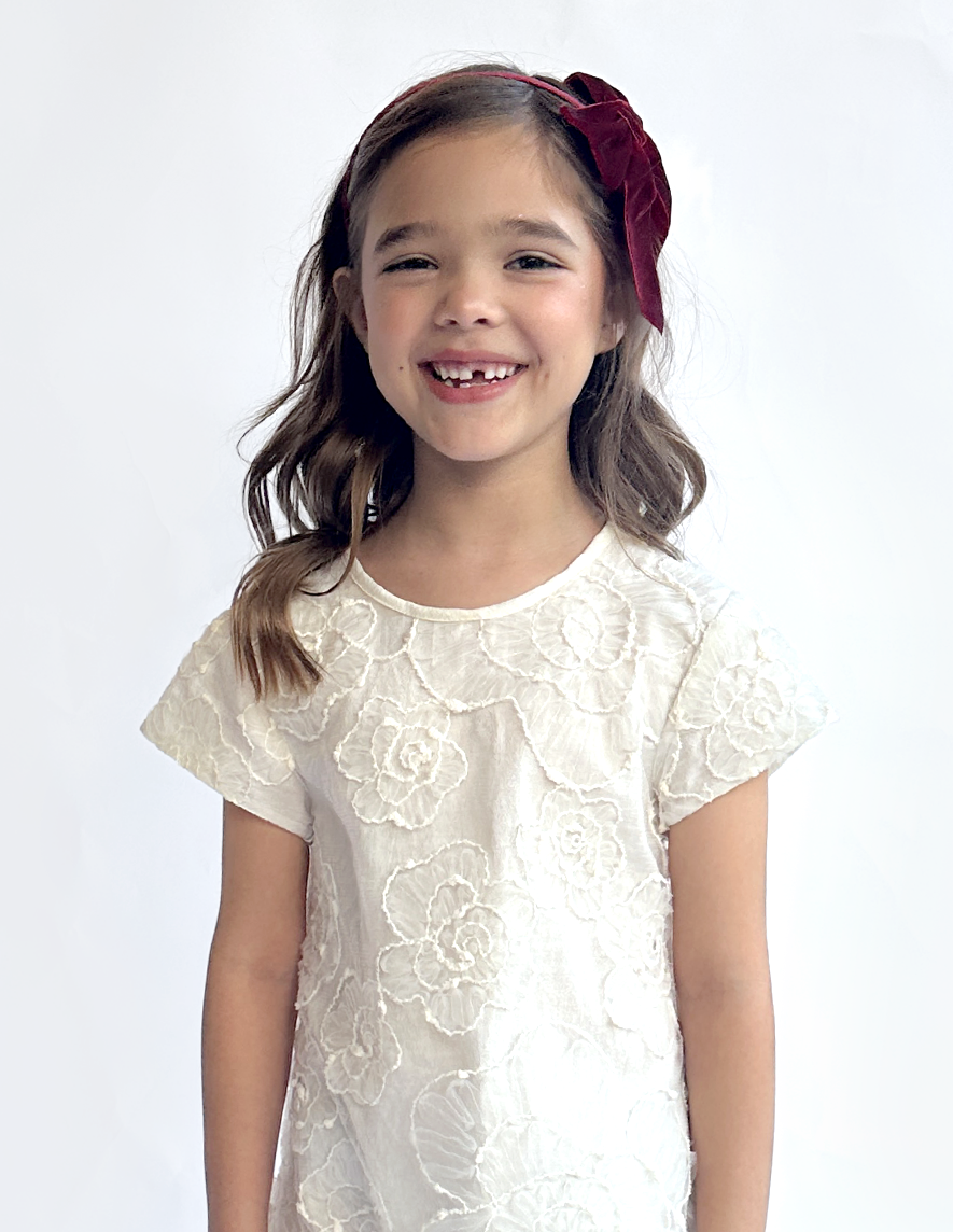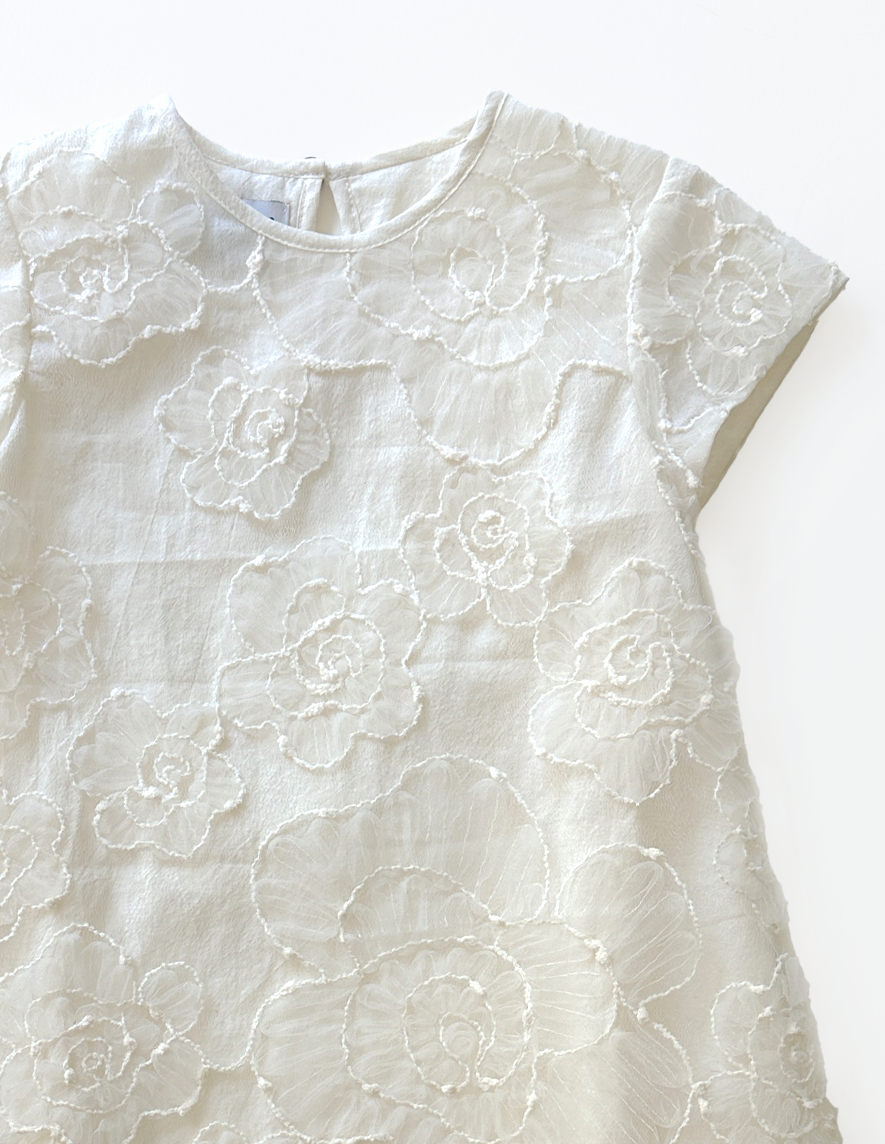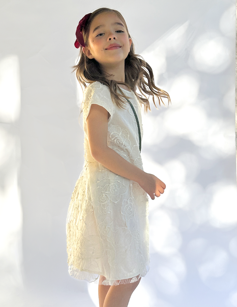 Un vestido encantador de flores bordadas sobre tul, forrado con suave algodón para máxima comodidad. En un tono ivory super combinable y atemporal. Este diseño romántico y femenino es perfecto para eventos especiales como bautizos, primeras comuniones o una linda sesión de fotos. Su largo justo a la rodilla y su calidad única hacen de este vestido una opción ideal para usar una y otra vez.