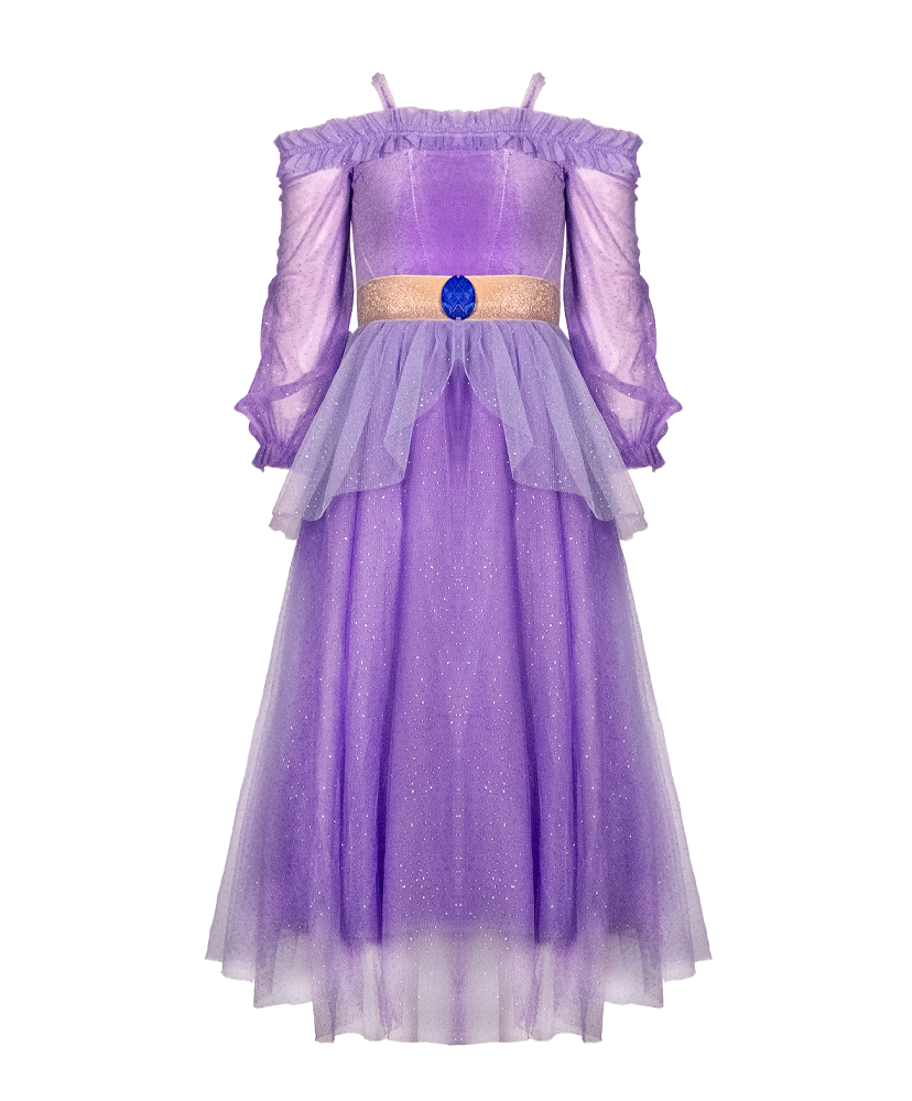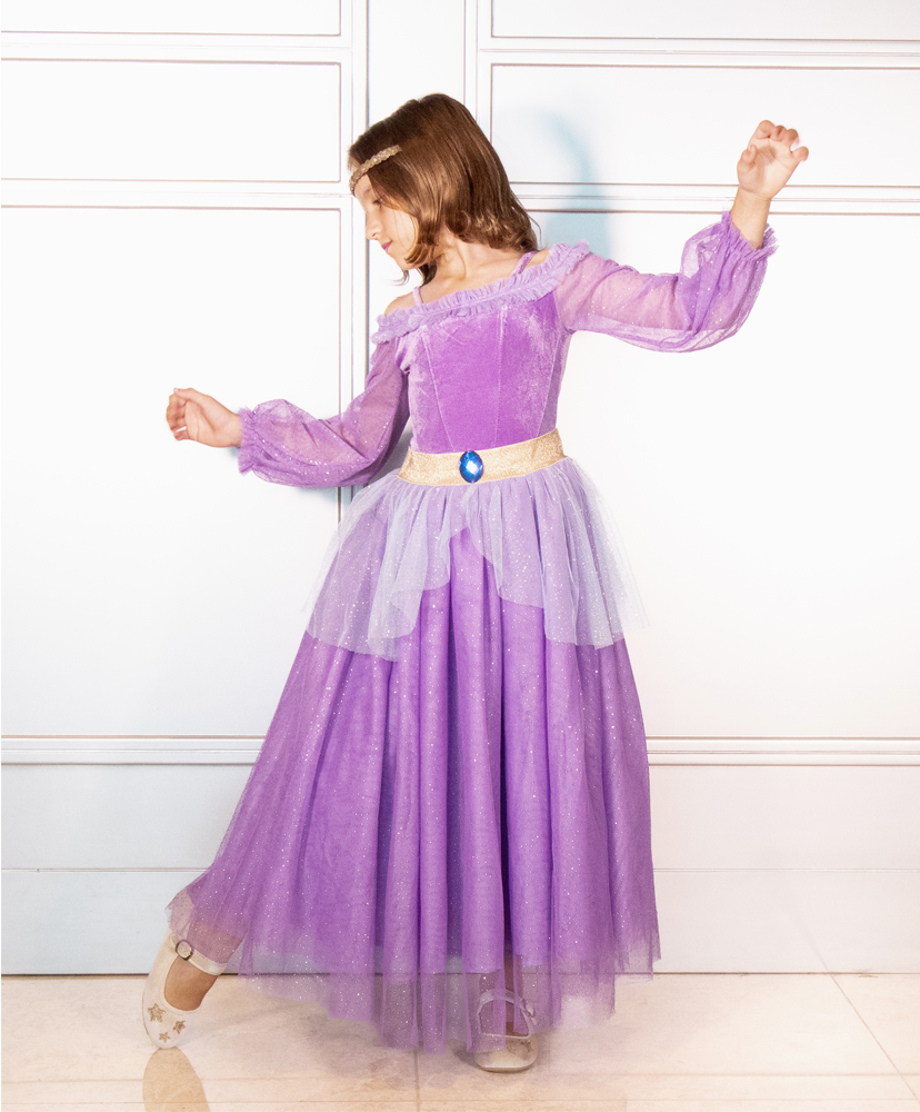 La parte superior está confeccionada en suave terciopelo stretch para brindar comodidad y elegancia, con mangas Juliette decoradas con tul brillante que aportan un toque de fantasía. La cintura se realza con un cinturón elástico dorado con cristal azul al frente, evocando su espíritu real y aventurero.